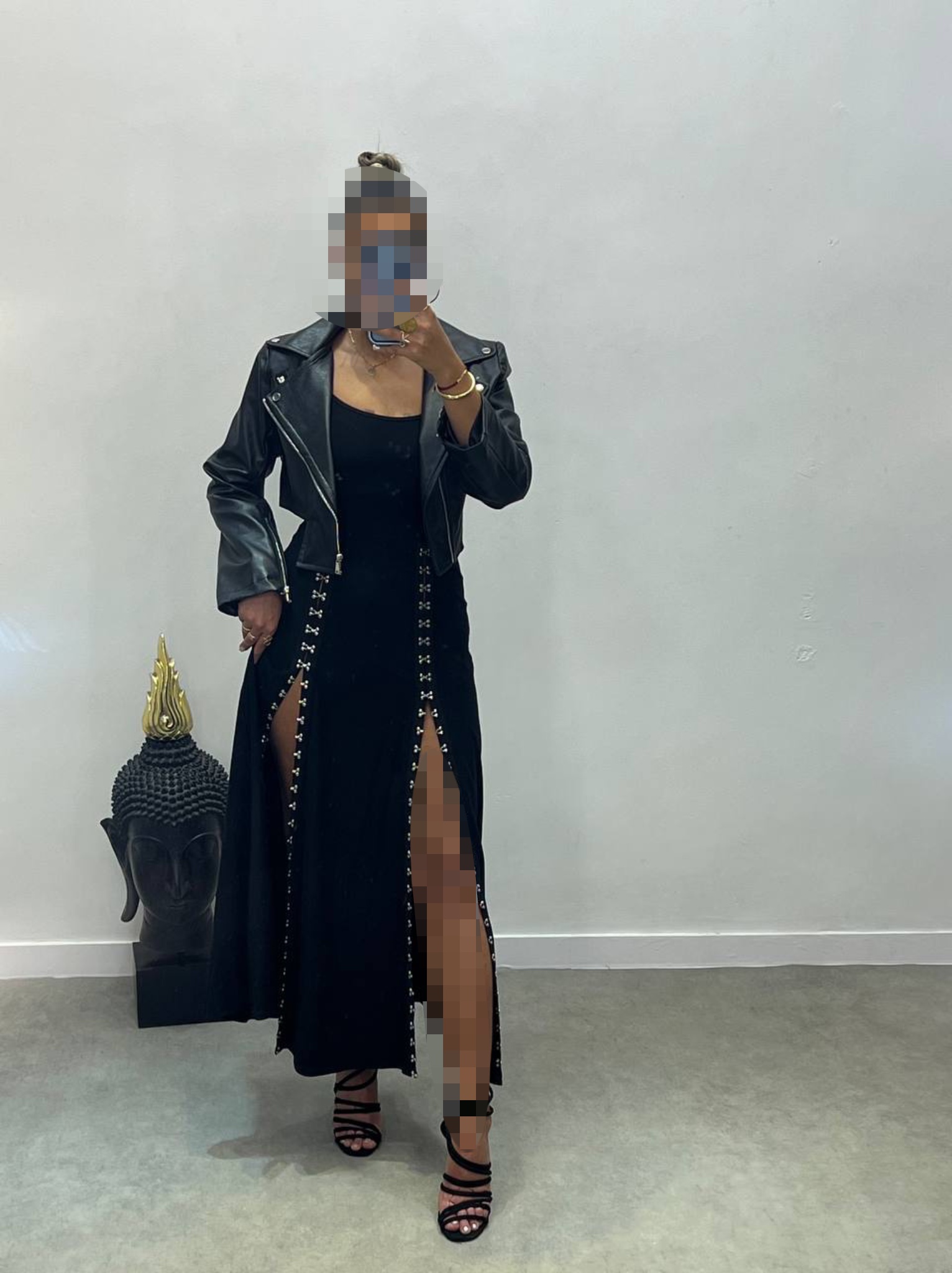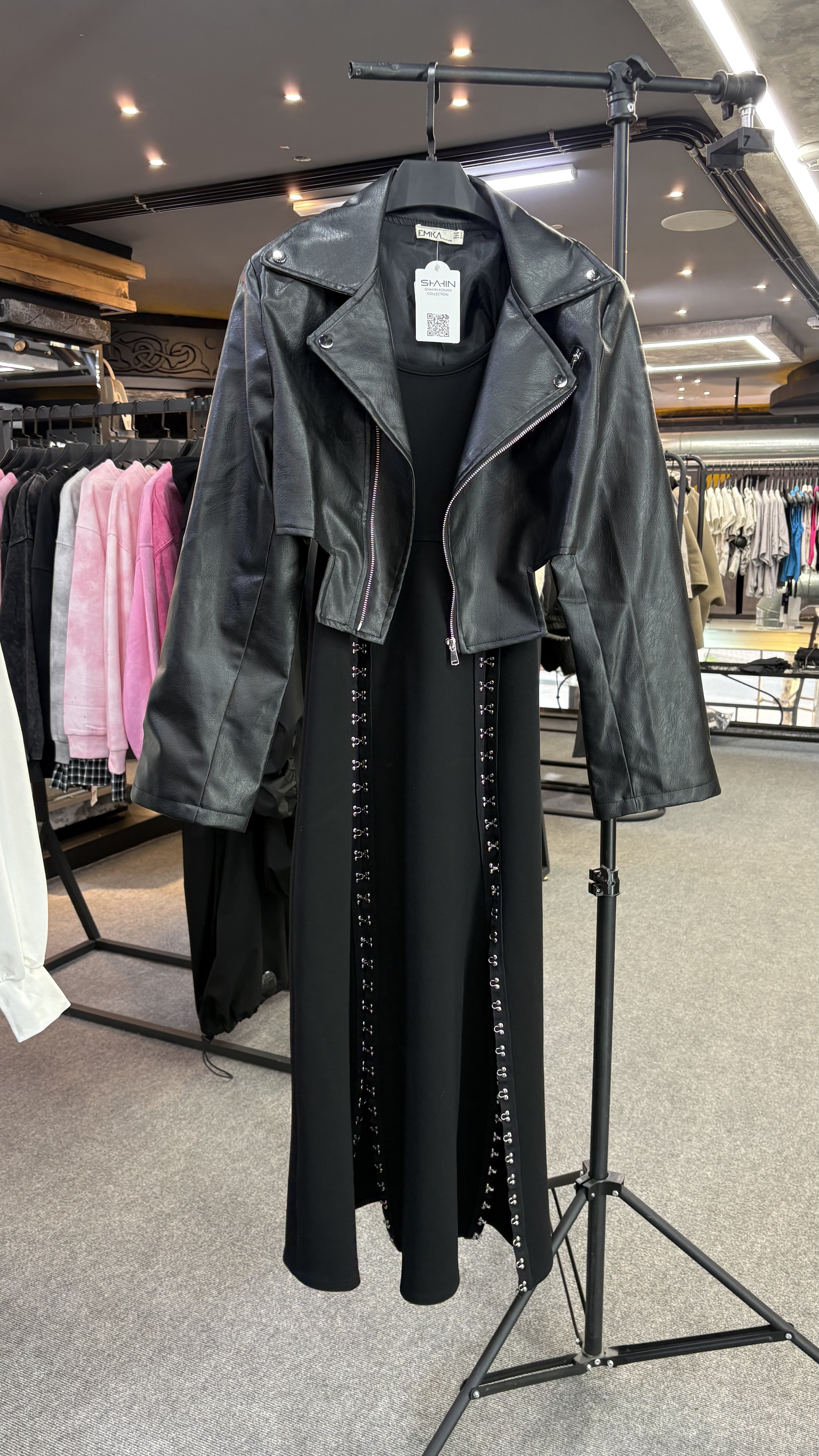 این ست شامل یک پیراهن آستین حلقه ای پانچدار با قد ۱۳۰ و یک کراپ کت چرمه که استایلای خفنی میتونید چه برای بیرون و چه برای مهمونی بزنید.